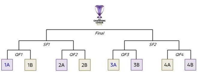每支球队将被抽入决赛淘汰赛的八个位置之一(1A-4A和1B-4B),确保形成四组跨区域对阵,如下图所示。